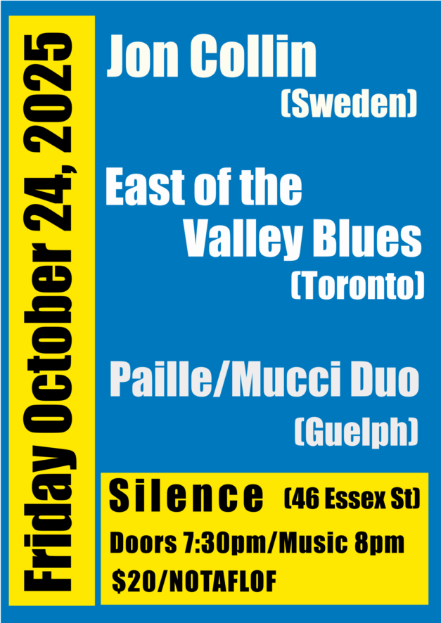 Friday October 24th Doors: 7:30 PM Show: 8:00 PM $20/NOTAFLOF Jon Collin Collin, who currently lives in Stockholm, plays his guitar with a similar disregard for incidental sound, audibly knocking the slide against the neck and occasionally moaning along with his swooping licks. Anyone who has heard the early recordings of Loren MazzaCane Connors will note the similarity, but Collin turns these tools to different expressive ends. Connor’s voice conveyed existential panic, late-night terror at the thought that he might be truly alone. Collin, on the other hand, seems to be expressing small but real comfort. The water and rocks and all the outdoors sounds that his microphone picks up on these six tracks, which were recorded near a lake in Bromma, Sweden, may not care about Collin, but he sounds at ease in their presence. (Feeding Tube) East of the Valley Blues Toronto musician Kevin Cahill has already amassed…