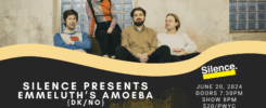 Accessibility: The Main Space at Silence is wheelchair-accessible (34″ clearance on doors) however there are no automatic doors. There is an accessible all-gender single-stall bathroom, with a round knob on the door. The show may make use of flashing lights and loud noises.